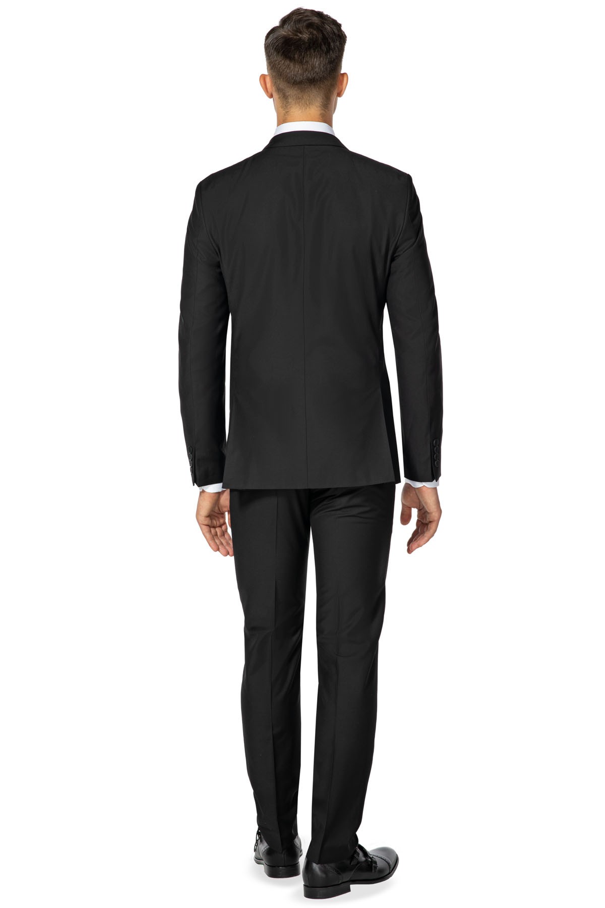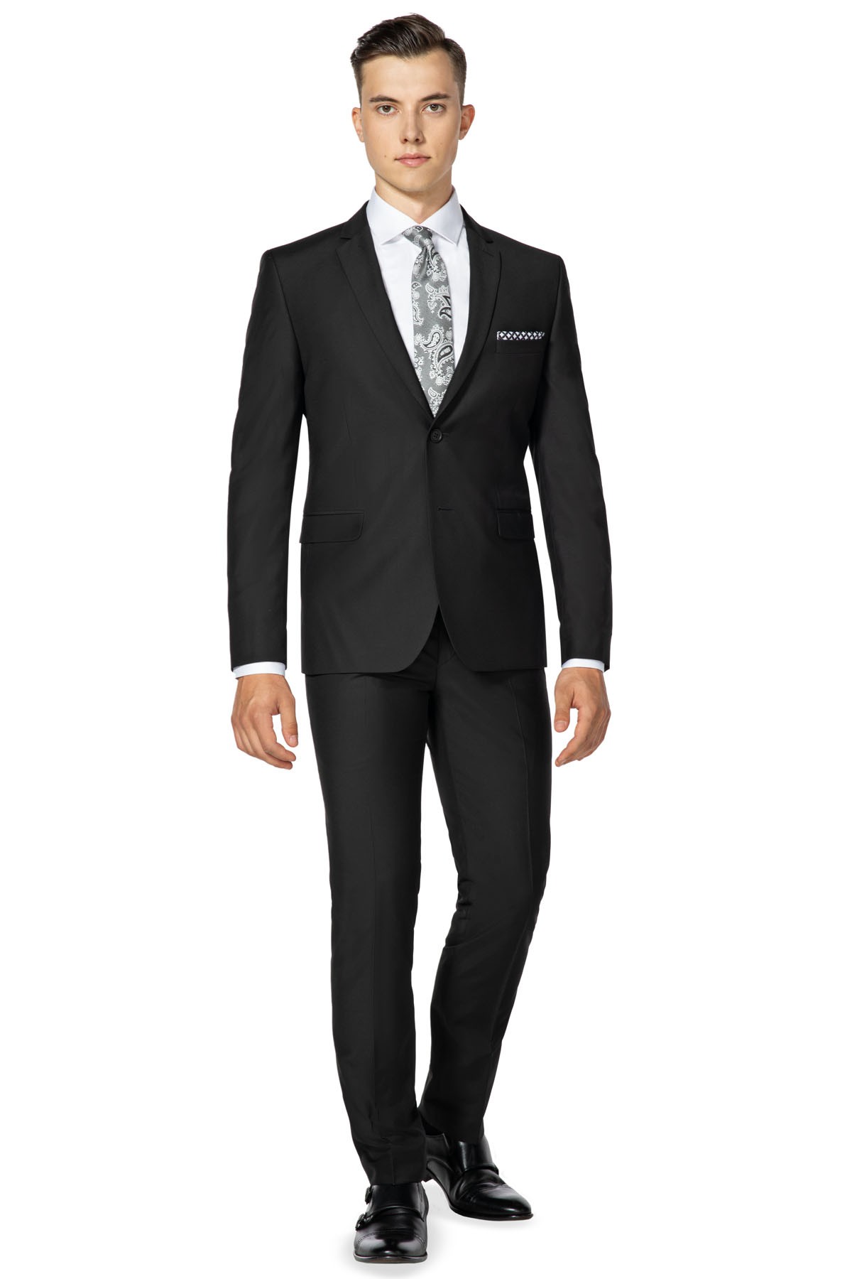 Pánsky oblek VILLARO v čiernej farbe. Určené pre mužov, ktorí oceňujú štýl a eleganciu. Jednokrídlový dvojdielny oblek v jedinečnom strihu Slim Fit, ktorý zaručuje výnimočný komfort nosenia a dokonalé prispôsobenie mužskej postave. Vyrobené z vysoko kvalitnej vlnenej tkaniny s prídavkom polyesteru.